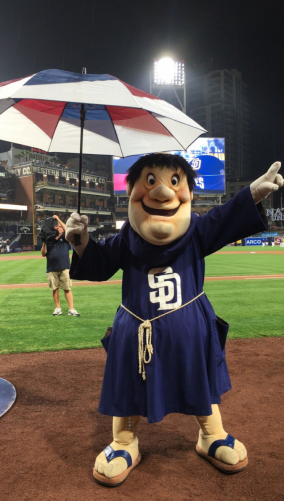 Photo: the Friar is ready for the rain.  Via @Padres on Twitter