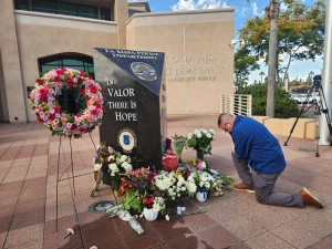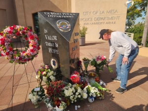 A man places flowers Tuesday afternoon at a memorial area at La Mesa Police Department headquarters honoring LMPD Officer Lauren Craven, who died Monday night as she worked to rescue motorists in a crash on Interstate 8 near Allied Gardens. (Photo, right, by Karen Pearlman)