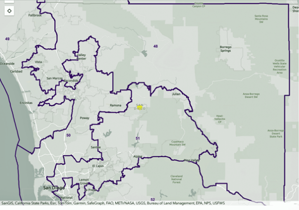 51st district: The 51st district currently represented by Democrat Sara Jacobs will now include many East County communities including La Mesa, El Cajon, Rancho San Diego, Lemon Grove, Lakeside, Guatay, Julian, Blossom Valley, Pine Hills, Pine Valley, Viejas, parts of Alpine and most of Spring Valley, as well as parts of San Diego including San Diego State University and areas west to Old Town.