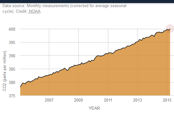 Dr. Connell then provided these facts on climate science. “NASA’s climate watch, Vital Signs of the Planet, shows that as of March, 2015, NOAA (The National Oceanic and Atmospheric Administration) reported that the climate change trend is increasing, as the rise of heat trapping gasses in the atmosphere continues…The trend has been clear for many decades, and the trend that matters has not changed, except to move upwards.” See for yourself at http://climate.nasa.gov/vital-signs/carbon-dioxide.
