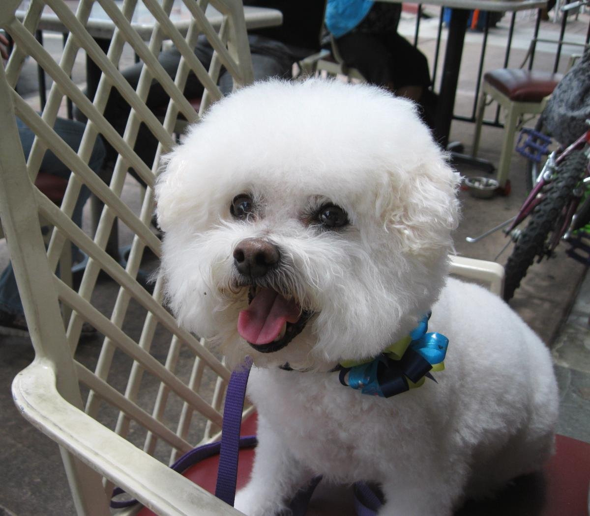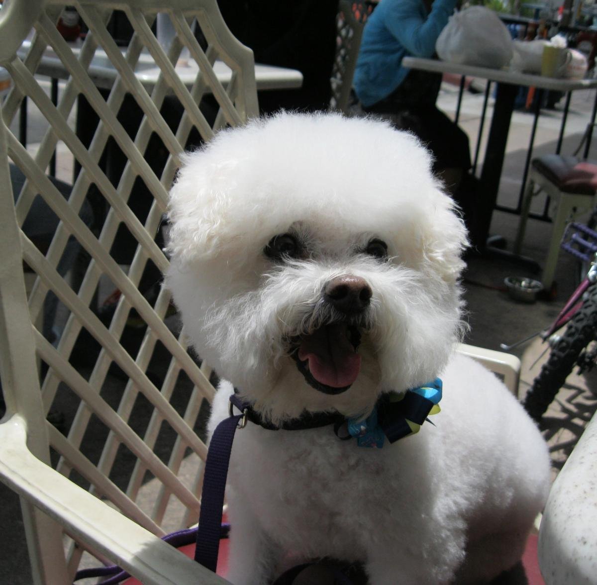 Marcel, a handsome 14 year old Bichon Frise, has been traveling since he was six. According to Espinosa, Bichon Frises were originally bred in Spain to be loyal lap dogs. Marcel fits that description, for although he is gentle, he is rather aloof with strangers, and clearly displays his devotion to his mistress.