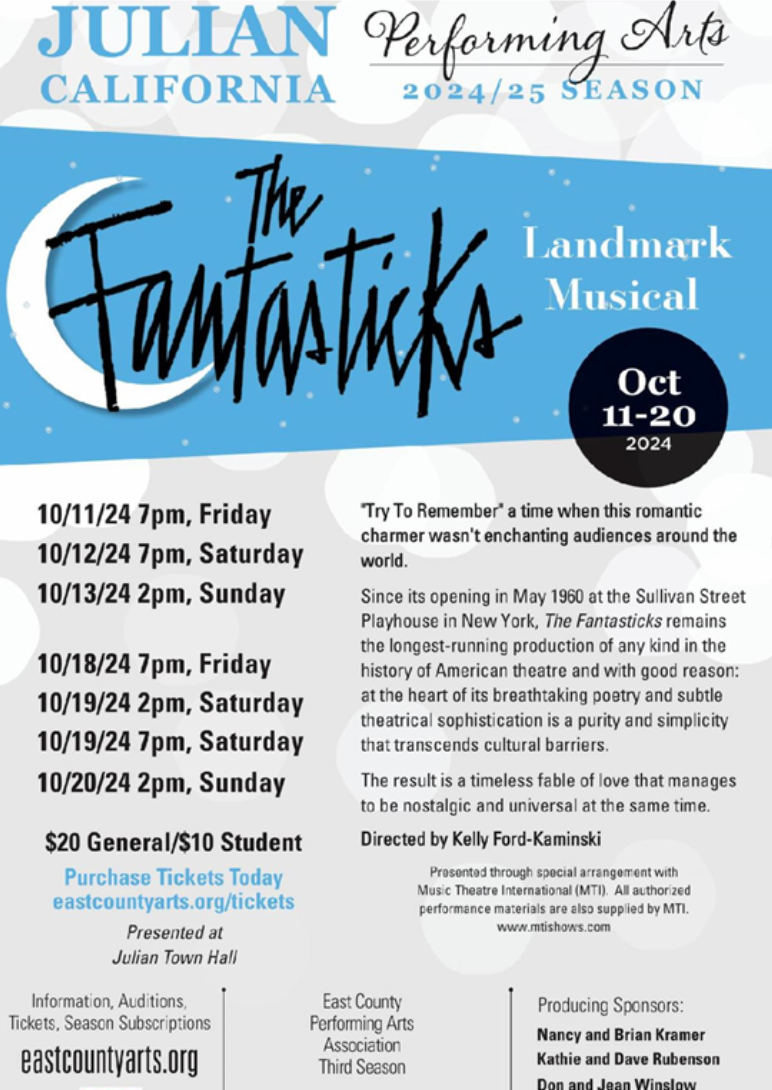 By East County News Service October 12, 2024 (Julian) – The Fantasticks is the longest running production in American theater, since its debut in May 1960 at the Sullivan Street Playhouse in New York. The musical features a timeless fable of love that is both nostalgic and universal, transcending cultural barriers. Julian Performing Arts presents the Fantasticks at