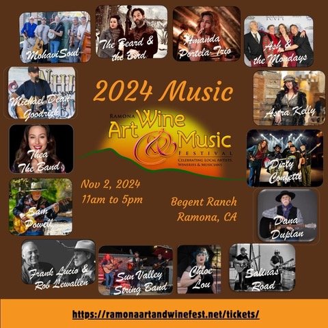 By East County News Service October 16, 2024 (Ramona, CA) — The Ramona Art, Wine & Music Festival will expand music performances to include live music on four stages, add beer and hard cider tastings, and introduce food and beer for purchase at its 12th annual festival on November 2 at Begent Ranch,18528 Highland Valley Rd., Ramona. Number