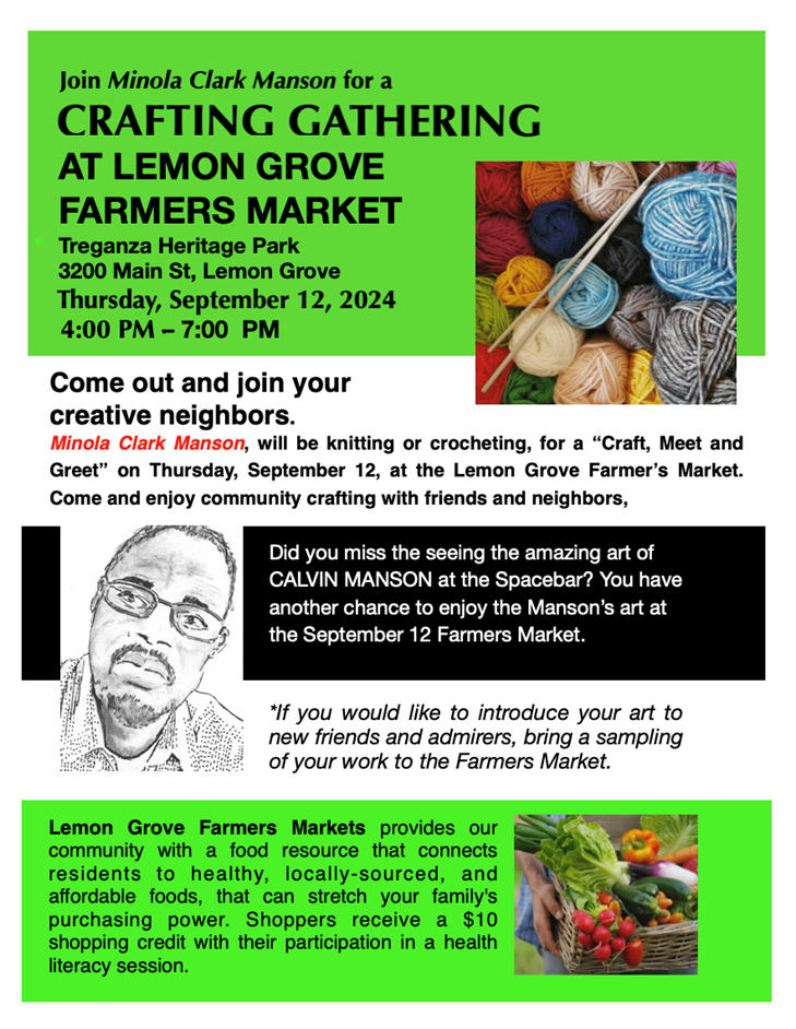 ARTIST CALVIN MANSON AT LEMON GROVE FARMER’S MARKET THIS THURSDAY;CRAFT MEET AND GREET ALSO PLANNED