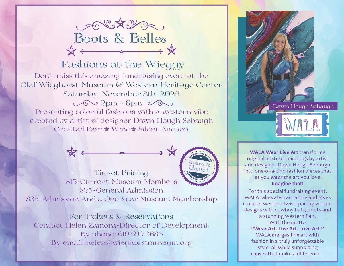 East County News Service October 16, 2025 (El Cajon) – Olaf Wieghorst Museum and Western Heritage Center will host its first annual Fashion Show Fundraiser – “Boots and Belles: Fashion at the Wieggy” on November 8 from 2 p.m. to 6 p.m. The event will feature stunning designs of local artist and designer Dawn Hough Sebaugh, whose WALA Collection blends the