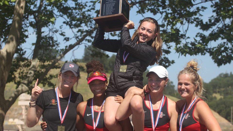 Sunday’s final was an even greater success for the varsity four crew, who shaved nearly 13 seconds off their prelim time, completed the course in 7:26.851 to take home gold. The Aztec V4 finished ahead of its six prelim competitors and cleared second by a margin of three seconds.