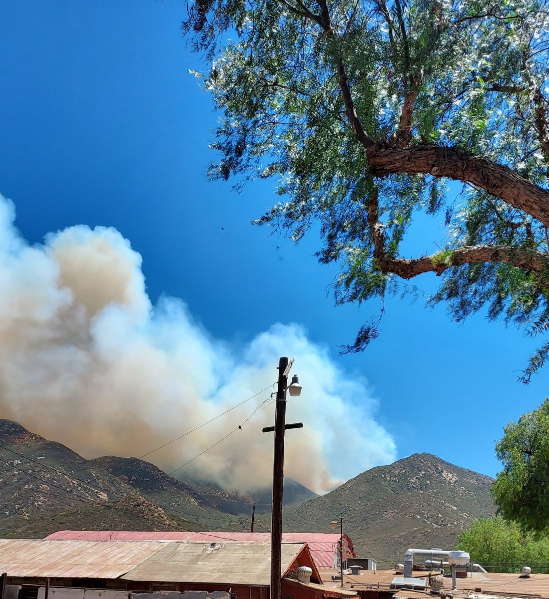 “I live at Barrett Junction, still managing the property that use to be the Barrett Junction Café,” Connie Kirkpatrick states in an email to ECM. “I have two fuel tankers here, refilling the choppers as needed. Fire department was here at 6 am this morning, met, then dispersed, we still have a few vehicles here for meals and other supplies for them. I have been watching the fire move east along the other side of the Tecate Peak ridge.”