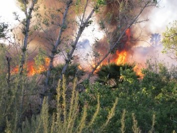 ECM reporter Patrick Ward is on scene. He says the fire is burning behind Michael’s. “So far they are able to keep the fire away from structures but it is burning down the river bottom in areas where they can’t get to it on foot. There is currently one helicopter dropping water from the City of San Diego.” Ward estimates this will be a “long-term commitment for the fire department.”