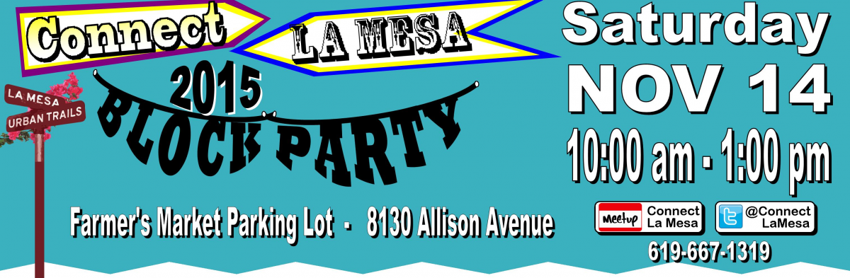 November 4, 2015 (La Mesa) – Connect La Mesa invites you to bring you family and friends to a fun and interactive Block Party on Saturday, November 14 from 10 a.m. to 1 p.m. at the Farmer’s Market parking lot on Allison Avenue.