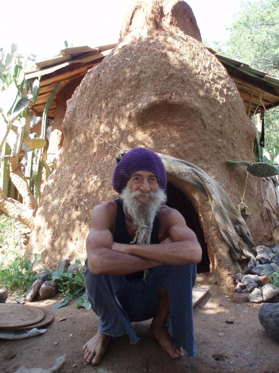 Today, he reclines in a lawn chair before a handmade adobe with arched entryways and stained glass windows, wearing a purple Rastafarian head wrap and a gray beard with curls that extend down to his sun-beaten chest. There’s a multi-level wooden tree house perched about 20 feet high in the foreground. An adjacent ceramic house—built with flotsam from a demolished tower—stands nearest to the roadway and contains a sunroom and meditation room. Clay kilns breathe warmth into at least two of the structures. A thin stream purls on the far side.