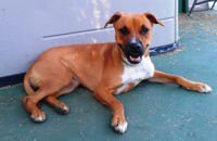 Honey, a boxer/lab mix is just that….as sweet as honey!! This wonderful girl is playful as well as loving. She weighs 42.60 lbs. She bonds very closely and would love a life of walking, hiking, jogging, camping or just cuddling. She plays well with other dogs, and is safe with children. As you can see by her big smile…she is a very happy girl!