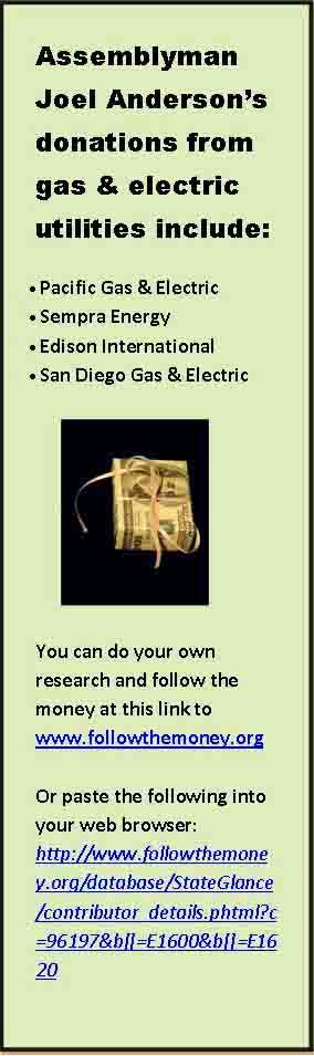 Then a search of the watchdog site www.followthemoney.org, revealed that Joel Anderson, while “opting out” of taking a position on this issue, had not opted out of taking money from the gas and electric utility providers, even receiving donations from utility companies that do not even operate in San Diego County.