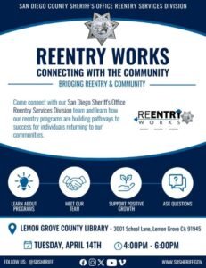 East County News Service April 13, 2026 (Lemon Grove) — The San Diego County Sheriff’s Office Reentry Services Division is holding a public event aimed at bridging the gap between life behind bars and life as a productive neighbor. From 4 to 6 p.m., Tuesday, April 14 at the Lemon Grove Library, the community is being invited to meet the