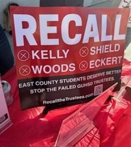 By Alexander J. Schorr Photo, left: Sign on table urging recall of four GUHSD trustees. May 11, 2025 (El Cajon) — The Grossmont Union High School District (GUHSD) governing board refused a last-ditch chance to rescind its layoffs of credentialed teachers, librarians, counselors, and psychologists at the May 8 board meeting, despite angry comments from constituents. After the public session,