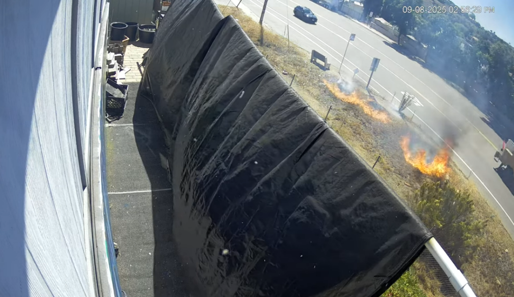 September 17, 2025 (Lakeside) — East County Magazine photographer Patrick Ward has obtained surveillance video from a Lakeside homeowner who lives next to the spot where the Coches Fire began. The video from the homeowner, who asked to remain anonymous, shows vehicles on the roadway around 2:56 p.m. on September 8, 2025, followed by brush igniting in several spots.