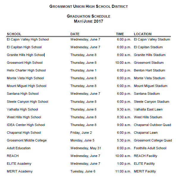 May 25, 2017 (San Diego’s East County) — Throughout the month of June, approximately 4,797 students earning a high school diploma from nine comprehensive high schools, two charter high schools and three alternative high schools in the Grossmont Union High School District will be donning caps and gowns for commencement exercises. Congratulations, East County graduates!