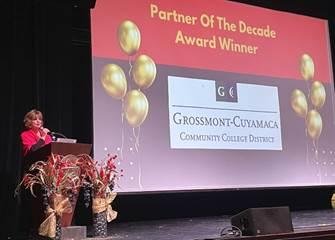 October 31, 2024 (El Cajon) – On Friday, October 25, the Grossmont-Cuyamaca Community College District was honored with a Partnership of the Decade Award from the East County Economic Development Council at their 40th Anniversary Gala. The event celebrated the accomplishments of the East County EDC, as well as their valued partners. The East County EDC recognized the most impactful partnerships over the past decade, and honored organizations that have played a crucial role in driving economic development in East County.