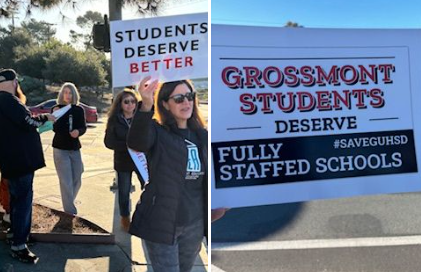 On the morning of Monday March 10, teachers and GEA representatives protested outside of nine school campuses: Grossmont, Monte Vista, Mount Miguel, Granite Hills, El Capitan, West Hills, Santanna, El Cajon Valley, and Valhalla High School. This is in the wake of the Governing Board’s decision to eliminate 64 jobs in the district: This includes 9 librarians, 23 teachers, 4 school psychologists, 10 vice principals, 1 principal, 2 program specialists, and 14 support staff. The board previously cut 30 temporary certificated employees earlier this year, which includes mental health counselors and A-G requirements counselors.