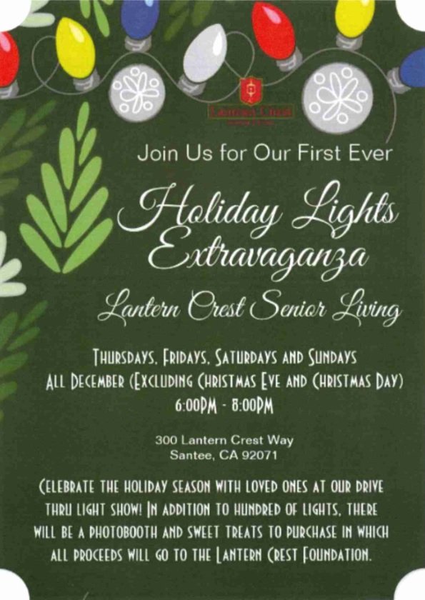 Lantern Crest Senior Living in Santee will transform into a drive-through holiday extravaganza open to the public each Thursday through Sunday night in December  from 6 to 8 p. m. Lantern Crest is located at 300 Lantern Crest Way in Santee.