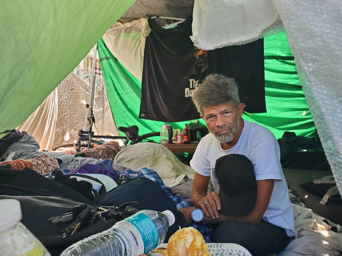 By Angela Hart for KFF Health News. Broadcast version by Suzanne Potter for California News Service reporting for the KFF Health News-Public News Service Collaboration File photo, left, by Miriam Raftery: A homeless man living in a makeshift tent in Lemon Grove in 2024 April 26, 2025 (Washington D.C.)– President Donald Trump is vowing a new approach to getting homeless
