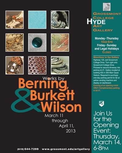 March 1, 2013 (El Cajon) – The Hyde Art Gallery at Grossmont College presents “Works by Berning, Burkett and Wilson” a Ceramics exhibition by Trent Berning, Richard Burkett and Lana Wilson March 11-April 11. These ceramic works all share the concept of merging utilitarian forms with a personal vision and expression that goes beyond their utility.