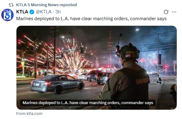 By Alexander J. Schorr Photo: KTLA screenshot: flashbang deployed amid L.A. civil unrest at Los Angeles Sheriff’s officer looks on June 11, 2025 (Los Angeles) — California sued the Trump