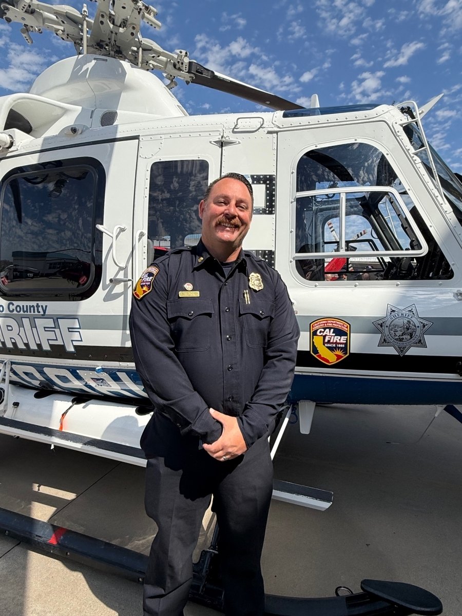 Photo: Cal Fire Deputy Chief Ryan Villarino beside a San Diego County Sheriff’s firefighting helicopter.