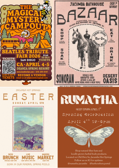 April 3, 2026 (Jacumba Hot Springs) – Sunny, mild desert weather sets the stage April 4 and 5th, for a stellar weekend full of music, outdoor fun and fantastic food, a new shop opening and more. The weekend’s events include a Beatles tribute music fest and campout, bathhouse bazaar, Easter Brunch, and an herbalist’s new shop opening.