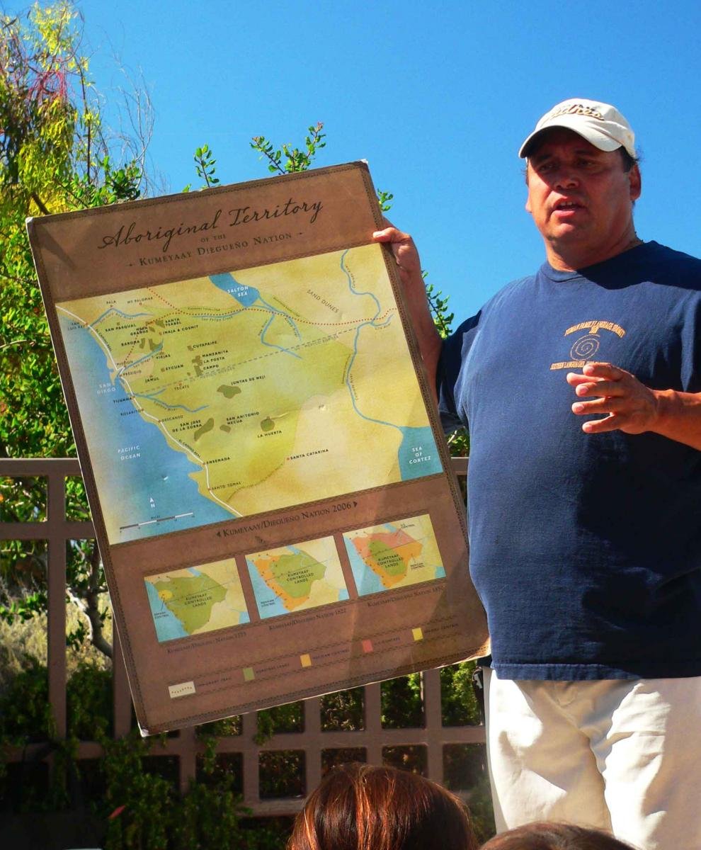 Guassac showed children an aboriginal territory map (photo, right) of the Kumeyaay Digueno Nation in 1775, right after the Spanish arrived in California. “It’s important to you because it is your past and it is your future,” he said. “We’re ocean, mountain and desert people.” He passes