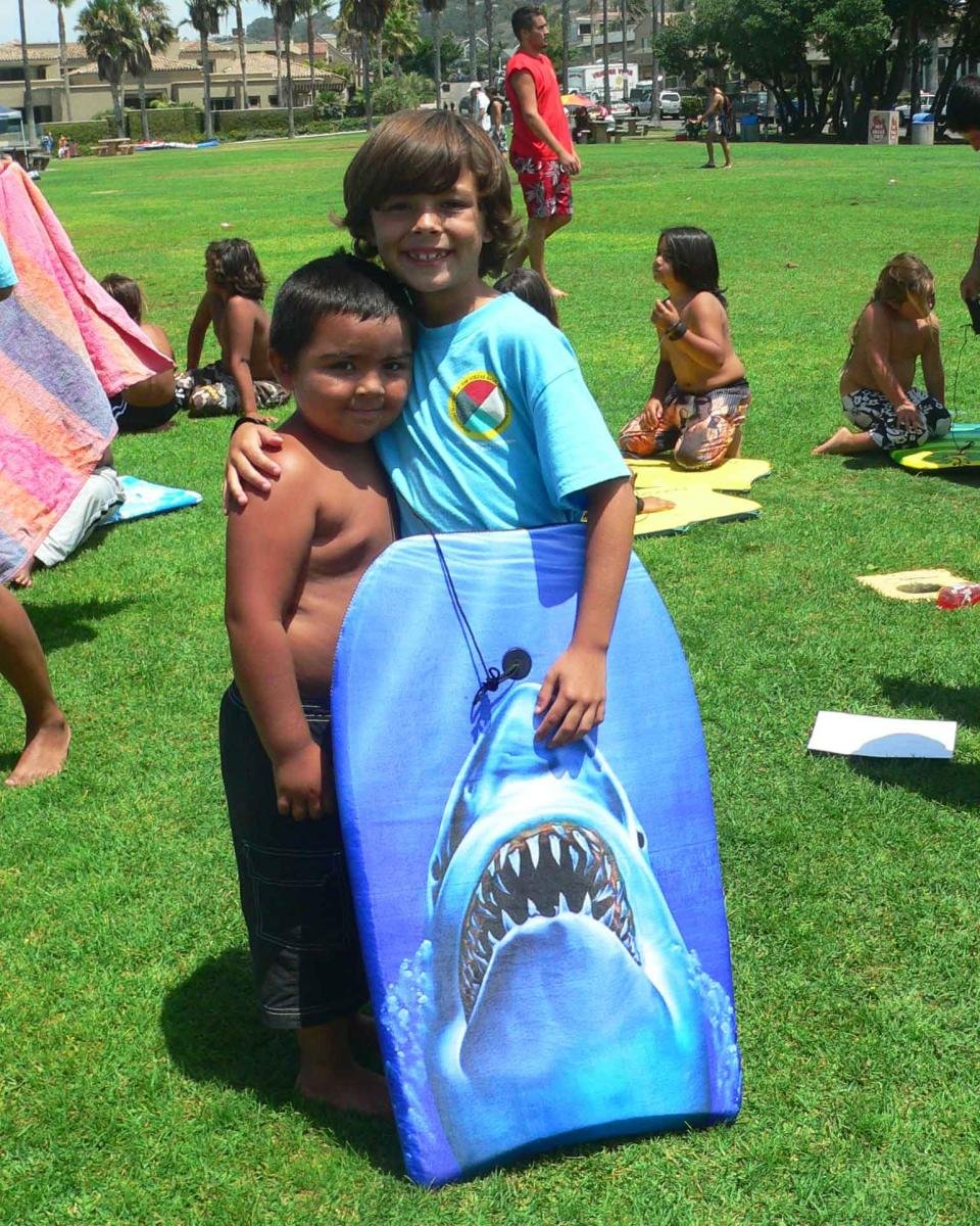“What if the sharks eat us?” one of the kids inquired. Instructors reassured everyone that there has never been a shark attack on a surfer in the surf zone in San Diego County—and that leopard sharks have mouths too small to bite people. Kids also learn how to shuffle their feet beneath the water, dispersing any stingray that may be nestled beneath the sand.