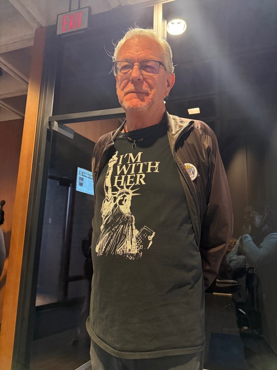 Brian Kougl (photo, left) with the San Diego organizing project, wearing a T-shirt with the statue of liberty proclaiming ‘I’m with her,’ said mass deportations are unpatriotic, immoral and wrong. “You should not support the hate-filled agenda of a delusional convicted felon,” he said of President Donald Trump, who has 36 felony convictions.