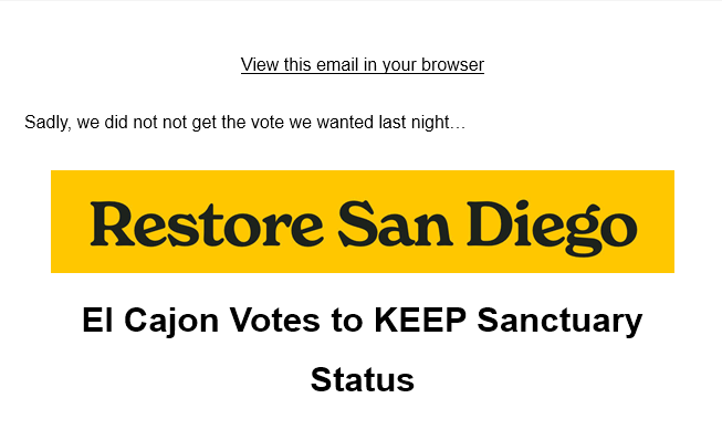 After the hearing, Reichert sent out an e-mail blast to conservative followers, with a headline claiming that the Council majority had voted to “keep sanctuary city status.” That is false, since El Cajon has never been a sanctuary city and every council member has voiced opposition to sanctuary city policies. No new protections for immigrants were adopted, nor were any existing ones removed by Councilmembers.