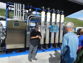Photo, right:  Ryan Hughes, PD employee, explaining part of the process at the advanced water purification system at the plant.