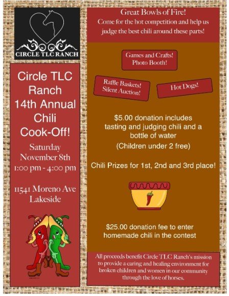 East County News Service Oct. 12, 2025 (Lakeside) — Circle TLC Ranch-Equine Therapy is holding its 14th annual chili cookoff in November. Dubbing itself “the best chili cook off in