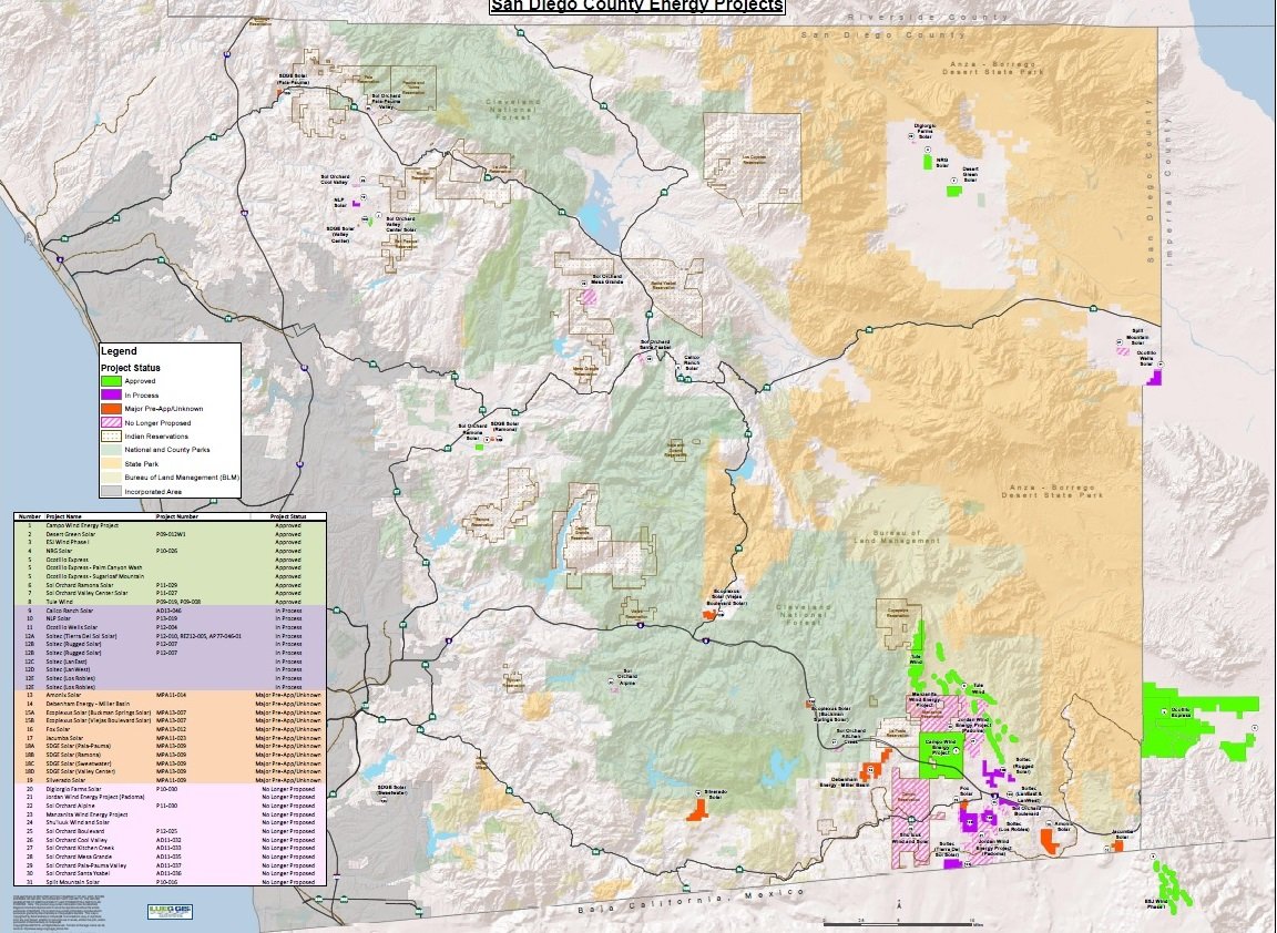 To view a full-screen map of all major energy projects proposed in San Diego County (smaller version shown below) to learn what’s planned in your community, click here.