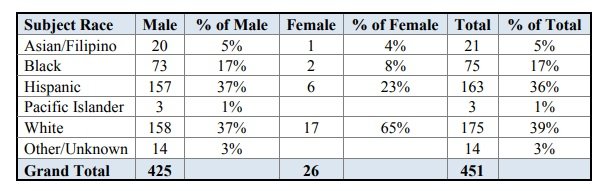 In the larger preponderance of cases, the subjects were either black or Hispanic, and out of the total number of cases, forty percent involved a white officer shooting a non-white subject.