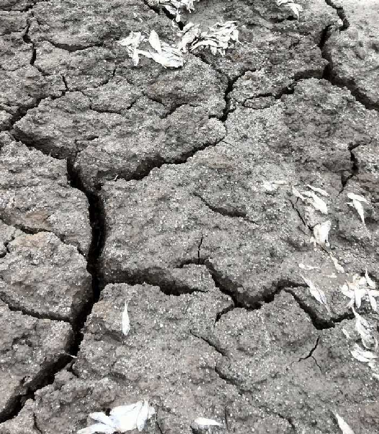 Photo, right: dead fish at lake bottom when drained to deadpool in November 2022.
