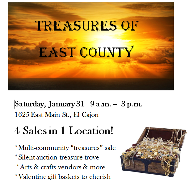 * Multi-community “treasures” sale (drop off yard-sale items in good condition starting at 7 a.m. RSVP to editor@eastcountymagazine.org with description of items you plan to bring)