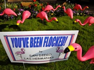 December 1, 2009 – – If you’ve wondered what’s up with those pink flamingo flocks you’ve been seeing around East County, wonder no more. In a clever response to charity fundraising in a down economy, San Diego La Hermanas is stealth-flocking people’s yards.