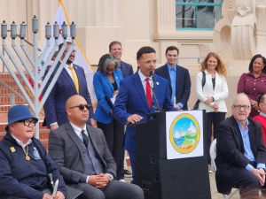 Organized by San Diego County Assessor Jordan Marks (shown speaking in photo above right), Monday afternoon’s "Rally for Light," marked the eighth and final day of Hanukkah, and the hour-long event ended with a ceremonial lighting of a 6-foot hanukkiah (menorah) by local faith leaders, county employees and community members.