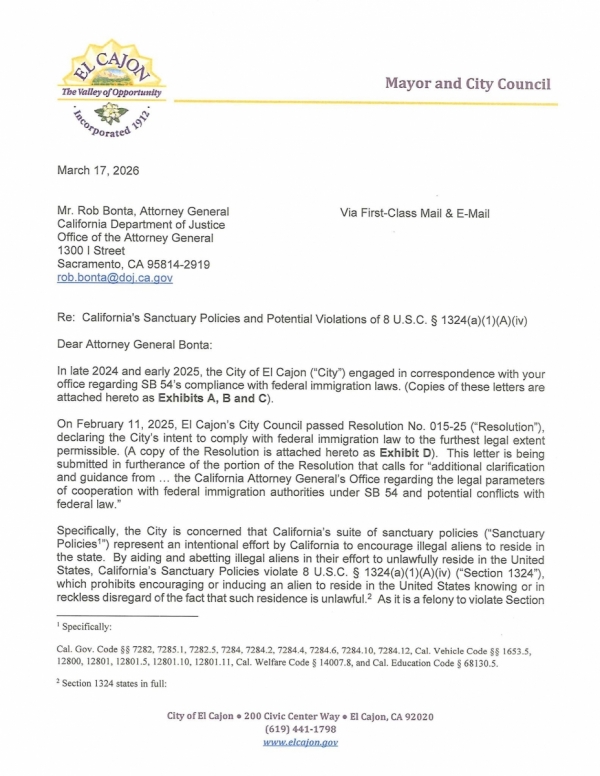 March 19, 2026 (El Cajon) — A deepening rift between local autonomy and state mandate is in the spotlight in El Cajon after Mayor Bill Wells sent a letter to the attorney general earlier this week.