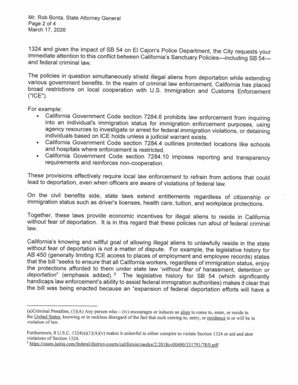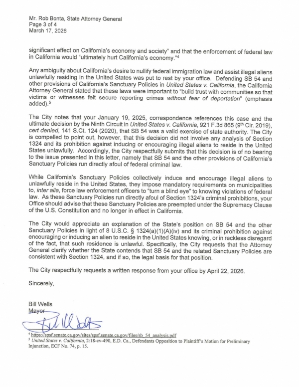 A letter dated March 17, 2026 from Wells to California Attorney General Rob Bonta marks the city’s latest challenge to Senate Bill 54 from 2017, the California Values Act, which the Mayor alleges has created a legal "Catch-22" that endangers vulnerable children.