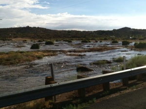 September 7, 2014 (Jacumba Hot Springs)—This high desert town in San Diego’s East County is normally characterized by dry washes. But tonight around 7:30 p.m., the town’s Centennial Committee chair Danielle Cook reports, “I received a call a half hour ago from another Jacumba resident, Bill Pape, saying to "get down to the bridge right away, there is a flash flood here and about 20 of us are gathering to watch it.”