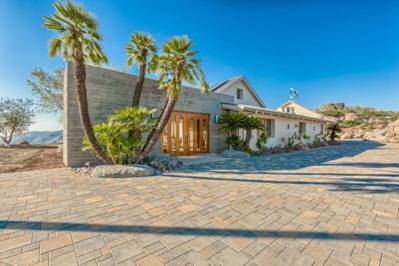 Photos: exterior: Ramona residence is energy efficient and blends with natural environment. Interior: Boulder provides thermal heat and dramatic focal point in Jamul