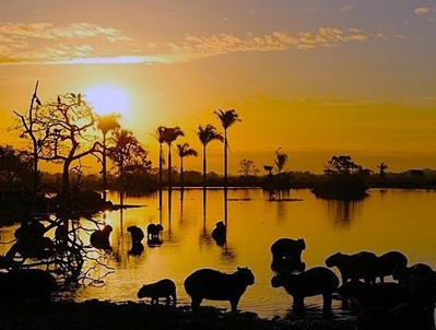 Photo by Renee Owens:  capybaras and sunset in Venezuela’s llanos