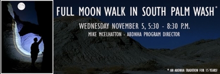 October 21, 2025 (Anza Borrego)—You’re invited to walk by the light of a full moon in Anza Borrego Desert State Park’s South Palm Canyon Wash on November 5 from 6:30 to  8:30 p.m.. The hike will be led by Mike McElhatton, education director at the Anza Borrego Desert Natural History Association (ABDNHA).