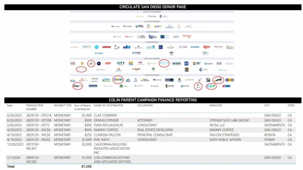 A cursory glance of Parent’s contributions finds at least eight donors who have donated to both his campaign and his non-profit organization Circulate San Diego. The donor names were included in his State of California campaign finance reporting and Circulate San Diego’s website.